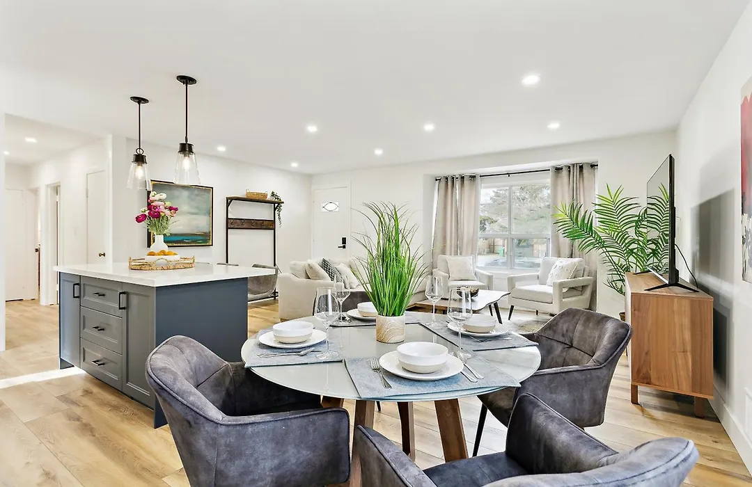 Stylish 3Br Home, Close To Restaurants, Shops Mississauga biedt de gasten een patio en een eethoek, waar strijkfaciliteiten en airconditioning, samen met TV met meerdere kanalen zijn beschikbaar. De kamers zijn uitgerust met koffie- en theevoorzieningen en bieden een bank en een bureau aan.
